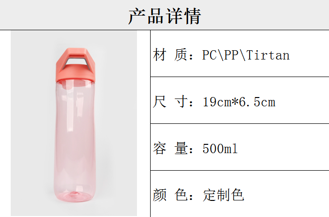 產(chǎn)品特點:PC/PP材質(zhì),500MLDD容量,顏色可定制,