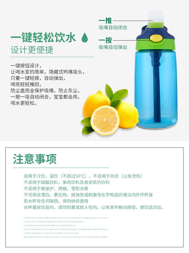 產(chǎn)品特點(diǎn):鴨嘴式兒童吸管塑料杯,防漏防溢,安全材質(zhì),一鍵喝水,5OOML容量,多種顏色選擇,寬口吸嘴喝水更流暢